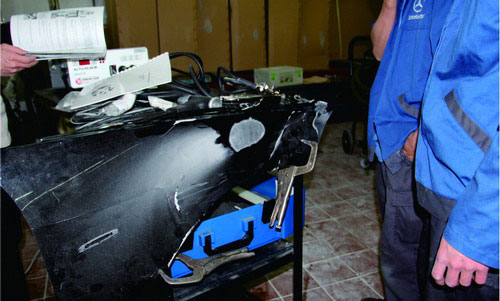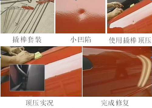 對于鋁板上的小凹陷,可以使用日照燈尋找凹陷點(diǎn),再用撬棒頂壓法,從板件內(nèi)側(cè)慢慢往外頂,但要注意不能過度頂壓,如圖1-91所示為撬棒頂壓法實(shí)例圖。
