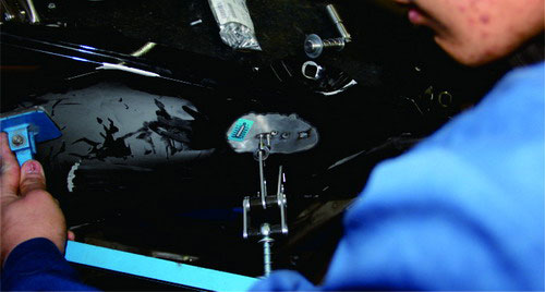 (8)相對于鋼板修復(fù),鋁質(zhì)車身板件更換的定位工作顯得更為重要。鋁質(zhì)車身粘接部位的粘接膠需要較長的固化時(shí)間,為防止粘接膠在固化后車身尺寸產(chǎn)生位移或變動(dòng),測量后必須使用定位夾或通用夾具對更換部件進(jìn)行定位。