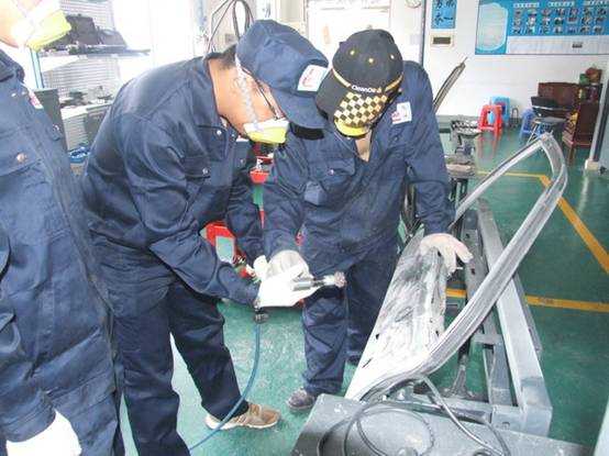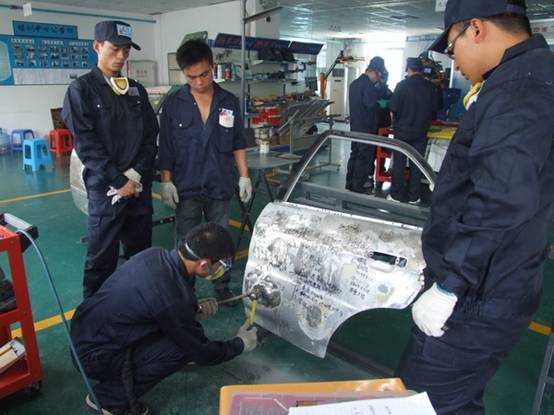 老師們使用鈑金工具套裝進(jìn)行修復(fù)車(chē)身的練習(xí)