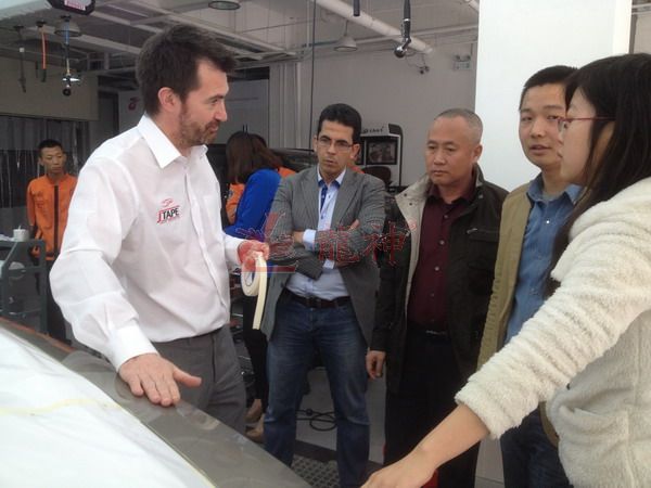 本司訊:2013年4月北京晴空萬里,龍神公司特邀英國專家一行五人,來到了北京車爵士進行汽車噴涂遮蔽技術(shù)交流。首先公司一行了解車爵士的汽車噴涂情況及詢問了使用的遮蔽工具情況。隨后英國專家針對在汽車噴漆時難噴涂的車門縫隙、玻璃死角等地方的專業(yè)遮蔽工具的演示。車縫泡沫膠:用于車身所有縫隙的遮蔽,有效隔離及遮蔽漆霧噴入車縫里。