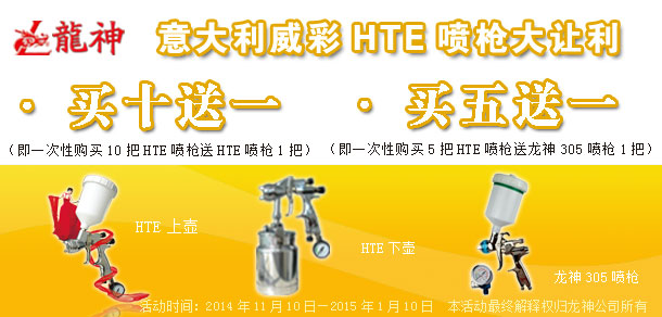 活動(dòng)內(nèi)容: 1、買十送一(即一次購(gòu)買十把HTE噴槍送一把HTE噴槍) 2、買五送一(即一次購(gòu)買五把HTE噴槍送一把龍神305噴槍) 活動(dòng)期間HTE上下壺噴槍的贈(zèng)送方式為:以多贈(zèng)送原則(如:買6把上壺+4把下壺,贈(zèng)送上壺。反之亦然,以此類推。)