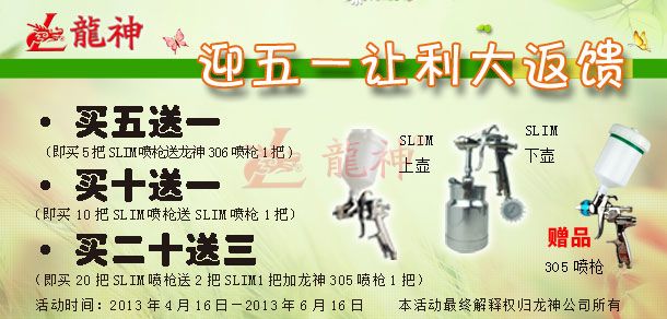 法國佩釜快速接頭促銷方案(產(chǎn)品編號:36102000-36119000)一、主題:“冰夏”促銷行動 二、目的:回饋新老客戶,讓利大反饋 三、時(shí)間:1、 啟動時(shí)間:2013年5月13日 2、 結(jié)束時(shí)間:2013年7月13日3、 時(shí)長:2個(gè)月 四、活動內(nèi)容:1、 買二十送一(即買二十個(gè)快速接頭送一個(gè)法國佩釜快速接頭或法法國佩釜吹塵槍(編號:38016)一把) 2、 買五十送三 3、 買八十送防靜電噴漆軟管(編號:36323)五、其它 1、本活動最終解釋權(quán)歸珠海龍神所有。