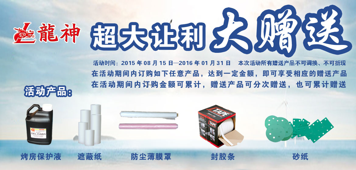 超大讓利﹒大贈送 2015-08-17 31796 訂購產(chǎn)品:1、烤房保護液; 2、遮蔽膜; 3、遮蔽紙; 4、泡沫膠條; 5、砂紙。 在活動期間內(nèi)訂購如上任意產(chǎn)品,達到下表累計金額,即可享受相應(yīng)的贈送產(chǎn)品。