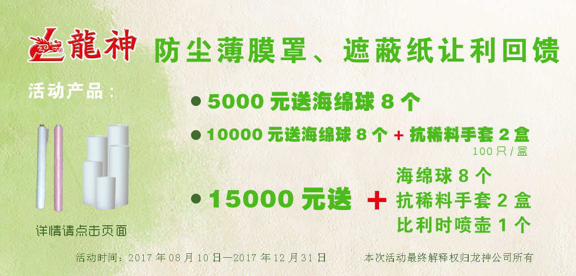 夏季讓利大回饋,遮避膜優(yōu)惠大促銷 2015-06-05 30096 買滿3000元,贈送紙漏斗500個; 買滿5000元,贈送除漆洗手膏1箱; 買滿8000元,贈送標準抹塵布1箱/24盒; 買滿10000元,贈送小切紙架1臺 。