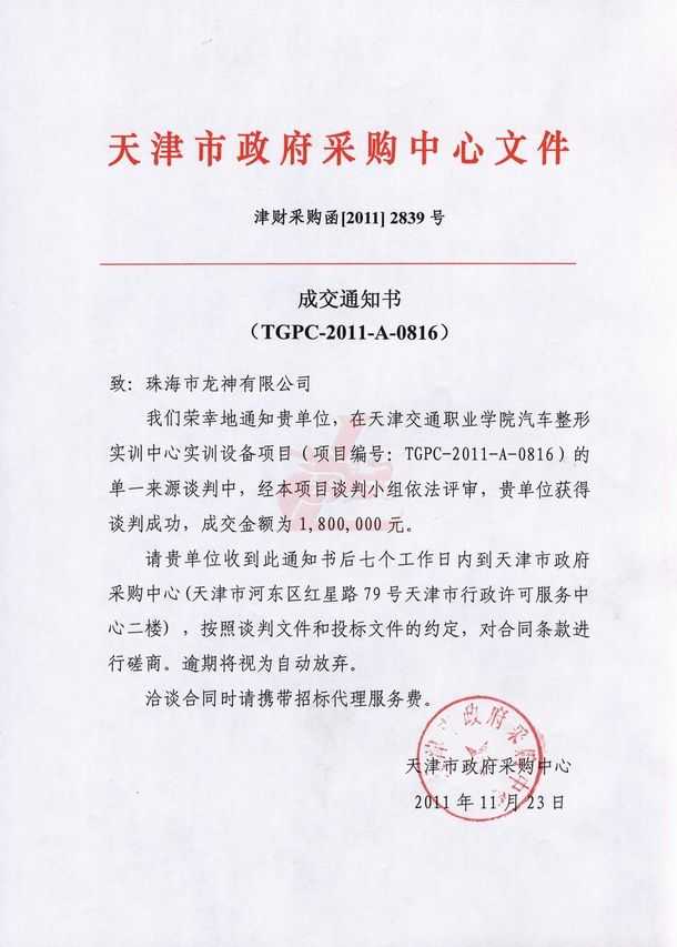 我們榮幸的通知貴單位,在天津交通職業(yè)學(xué)院汽車整形實(shí)訓(xùn)中心實(shí)訓(xùn)設(shè)備項(xiàng)目(項(xiàng)目編號:TGPC-2011-A-0816)的單一來源談判中,經(jīng)本項(xiàng)目談判小組依法審評,貴單位獲得談判成功,成交金額為1,800,000元。
